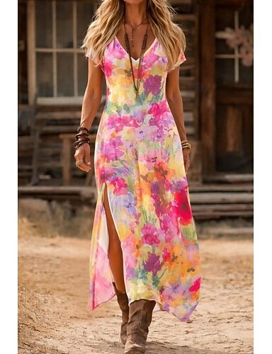 női maxi ruha bohém nyári ruha egy vonalú ruha vakáció hétköznapi bohém tengerparti alkalmi standard szabású virágmintás grafikus rövid ujjú v nyakú narancssárga piros rózsaszín nyár tavasz
