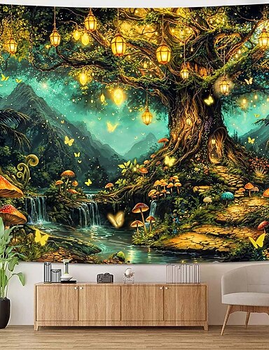 fantasy varázslatos erdő fali gobelin világító óriás fa lámpások falra akasztható piros gomba vízesés pillangók misztikus tájkép nagy szövet poszter hálószobába gyerekszoba dekoráció