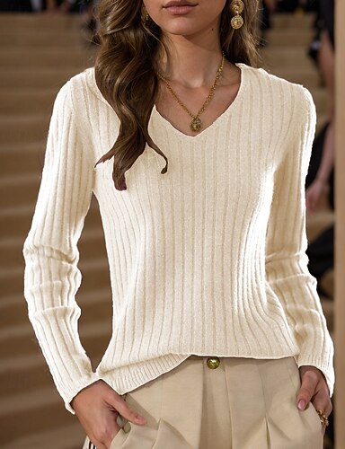 Női Pulóver Pulóver pulóver Alkalmi Puha Tiszta szín Bordázott V-alakú Kötött Hosszú ujj Normál felsők Kötött Szabadtéri Napi Hétvége Medence Bézs Ősz Tél