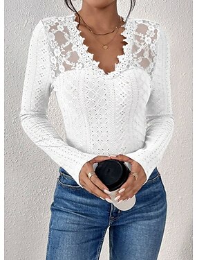 Női Csipke toldó felső Csipke Fűzőlyuk Tömör szín Elegáns Divat Szexi Hosszú ujj V-alakú Normál felsők Napi Alkalmi Hétvége Medence Fekete Fehér Ősz Tél