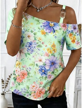 Női Póló Tee Top Nyomtatott Virágos Grafika Divat Klasszikus Alkalmi Rövid ujjú Félvállas Normál felsők Napi Alkalmi Hétvége Medence Arcpír rózsaszín Lóhere Nyár Tavasz