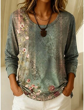 Női Póló Kerek Nyakú Hosszú Ujjú Tunika Virágos Grafikus Növények Vintage Stílusos Klasszikus Kerek Nyakú Rendszeres Felsők Napi Hétvégi Nyomás Fekete Fehér Rózsaszín Kék Zöld Nyár