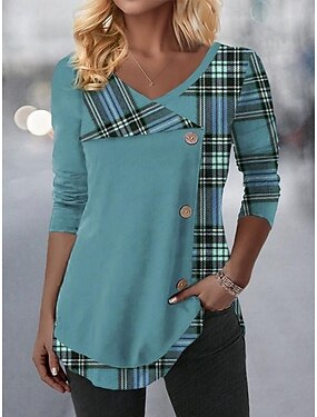 Női Blúz Tunika V Nyak Hosszú Ujjú Gombok Kockás Stílusos Kényelmes Normál Felsők Napi Nyomtatás Rózsaszín Kék Lila Zöld Tavasz Ősz