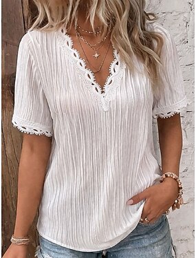 Női Póló Tee Top Csipke Kollázs Sima Elegáns Divat Stílusos Rövid ujjú V-alakú Hosszú felsők Hétköznapi Napi Alkalmi Fehér Nyár Tavasz