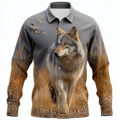 Férfi Állat Farkas Természet és tájak Ing Gombos póló Hosszú ujj Vintage Retro Hétköznapi Szabadtéri Vadászat Tavasz Ősz Térfogatcsökkenés 3D nyomtatás galléros ingek szürke 1# Szürke
