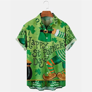 Szent Patrik Napja Férfi Ing Nyári Hawaii Ing Karikatúra Betűk Szent Patrik Napja Szent Patrik Napja Lóhere Hajtás Fehér Világos Zöld Kék Égszínkék Poros Kék Kültéri Utca Rövid Ujjú