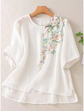 Női Póló Műpamut ágynemű Nyomtatott Virágos Divat Modern Alkalmi Rövid ujjú Terített nyak Normál felsők Napi Hétvége Fehér Bíbor Khakizöld Nyár Tavasz