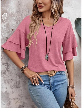 Női Póló Tee Top Fodrozott Sima Divat Stílusos Klasszikus Féhosszú V-alakú Normál felsők Napi Alkalmi Hétvége Fekete Fehér Arcpír rózsaszín Sötétkék Teveszín Nyár Tavasz