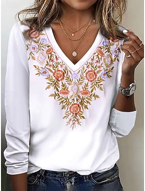 Női Póló Hímzett Nyomtatott Virágos Grafika Növények Szüret Stílusos Klasszikus Hosszú ujj V-alakú Normál felsők Napi Fehér Tavasz Ősz Tél