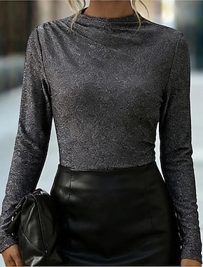 Női Alacsony Tee Top Redők Fényes Tömör szín Elegáns Stílusos Hosszú ujj Mock Neck Normál felsők Napi Party ruhák Fekete és szürke Tavasz Ősz