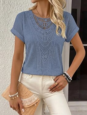 Női Póló Csipke Kollázs Sima Divat Stílusos Klasszikus Rövid ujjú Terített nyak Normál felsők Napi Hétvége Fehér Sárga Rubin Sötétkék Nyár Tavasz