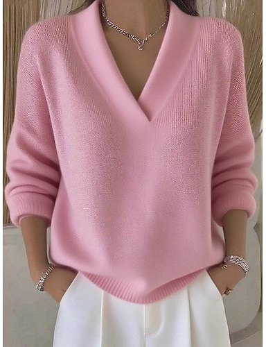 Női Pulóver Elegáns Divat aranyos stílus Tömör szín Bordázott V-alakú Kötött Fonott Hosszú ujj Normál felsők Kötött Előírásos Szabadtéri Otthon Vörösbor Arcpír rózsaszín Tavasz Ősz