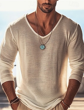 Férfi Ing Vászon ing Popover ing Nyári póló Strandruházat retro ingek Tömör szín Vakáció Szabadság Fehér Hosszú ujj V-alakú Nyár Tavasz Ruházat Rojtos