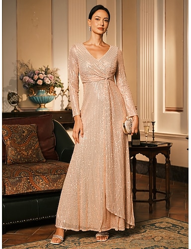 női maxi ruha egy vonalú ruha flitteres ruha földig érő csillámos, csillogó elegáns esküvői parti estélyi parti normál szabású egyszínű hosszú ujjú v nyakú pezsgőszínű ősz tél