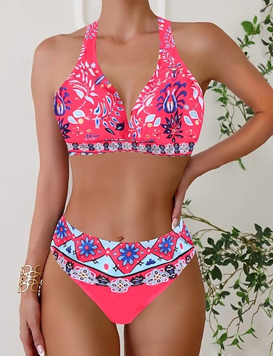 Női Fürdőruha Bikini 2 Részes Rövidnadrágos Fürdőruha Hátsó nélküli Karcsúsító Nyári Tengerparti Ruházat Virágos Nyakpántos Ujjatlan Fürdőruhák