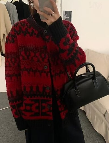 Női Karácsonyi pulóver Fair Isle pulóver Pulóver Kardigán Elegáns Szüret Divat Mértani Terített nyak Zseb Kötött Hosszú ujj Normál felsők Kötött Karácsony Szabadtéri Napi Fekete Rubin Ősz Tél