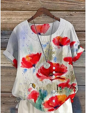 Női vászon-szerű műpamut ingek virágmintás alkalmi 3/4-es ujjú kerek nyakú normál felsők napi fekete piros lila zöld nyár