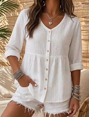Női 100% Pamut Vászon Blúz Nyári Ing Gombos Ing Művzkon Vászon Ráncos Gombok Aszimmetrikus Szegély Egyszínű Simítás Elegáns Stílusos Kényelmes Rövid Ujjú V Nyakú Hosszú Felsők Napi Ünnepi Kimenetel
