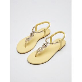 Élénk sárga lapos talpú női szandál csillogó strasszokkal - elegáns, T-pántos nyári cipők kristálydíszítéssel tengerparti esküvőkre, üdülőhelyi vacsorákra &trópusi nyaralások