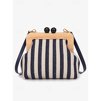 női csíkos vászon crossbody táska – retro favázas kis válltáska állítható pánttal – fekete és bézs, ideális hétköznapi kirándulásokhoz és utazásokhoz