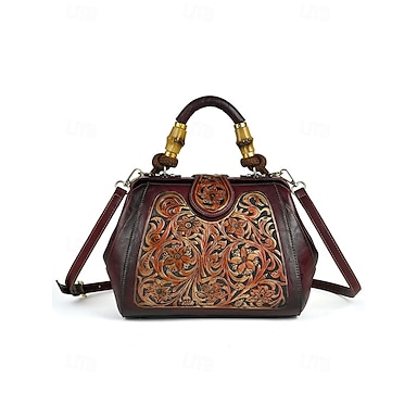 női műbőr kézitáska, vintage dombornyomott válltáska bambusz fogantyúval, elegáns keresztpántos táska hölgyek partijára, munkába és mindennapi használatra