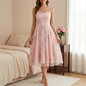 Elegáns 1950-es Déli Ruhák Spagetti pántok Hímzett Virágos A-vonalú Szögletes Jelmez Női Valentin nap Hétköznapi Zsúr Felnőttek Ruha Nyár