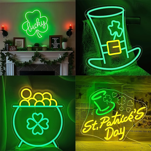 Szent Patrik-napi neonreklámok faldekorációhoz lóhere aranypénz kalap LED-es táblák neonbár táblák hálószobába USB világító tábla otthonra bár fali ember barlang buli klub étterem szálloda#12682900