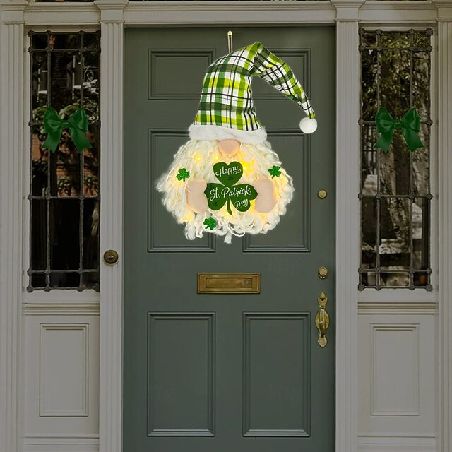 Szent Patrik-napi ír koszorú LED-es fényekkel, lóhere, arctalan baba, törpe dísz, 60x30cm, beltéri/kültéri veranda, fali dekoráció, nappali, étkező, parti ünnepi dekoráció #14170160