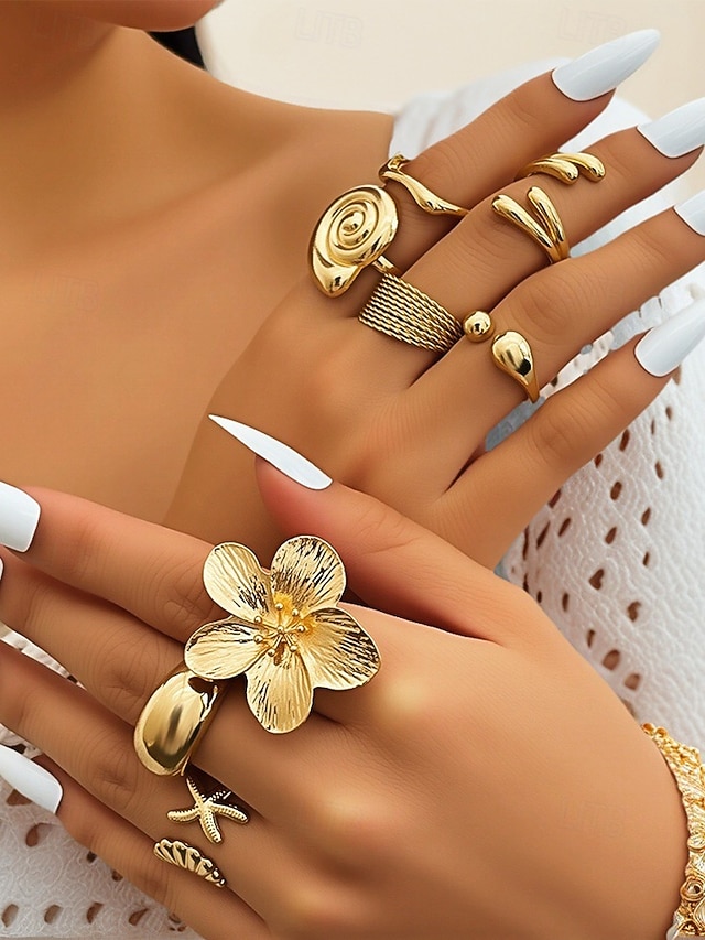 Női 8 darabos, állítható méretű aranyötvözet gyűrűszett – bohém, mutatós ékszer virágos, kagyló- és geometrikus mintákkal partikra, esküvőkre és mindennapi viseletre#15035108
