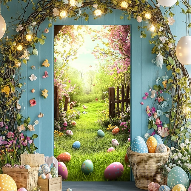 [Dizájn:] Az ajtóborító egy lenyűgöző tavaszi jelenetet ábrázol, ívelt fákkal, rózsaszín virágokkal, és elosztott pasztell színű húsvéti tojásokkal, amelyek egy varázslatos kert báját idézik. A szélek körül puha fények és finom virágok elegáns érintést adnak, így ez a dísz bármilyen dekorációs stílusban kiemelkedő darab.