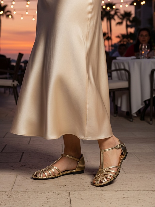 női arany metálfényű ketreces szandál - elegáns lapos, pántos alkalmi cipők üdülői estékre, kényelmes T-pántos nyári szandálok nyaralási vacsorákhoz &hajózási ruházat#19240700