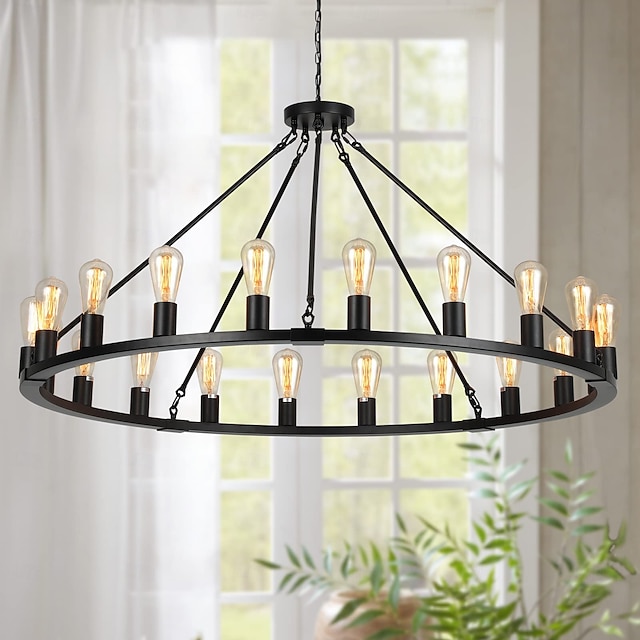 ?Extra nagy szekérkerék-csillár?Matt fekete csillár feltűnő szekérkerék-kerettel és 20 égővel. A 48" átmérőjű csillár 360 fokos megvilágítást biztosít, nagyobb és fényesebb, mint a hagyományos szekérkerék-csillárok.