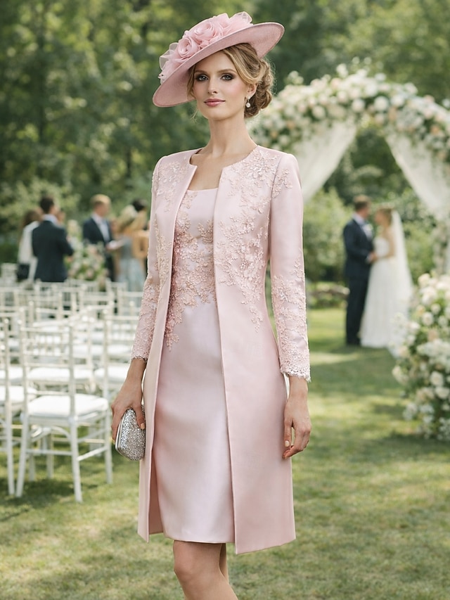 Kétrészes Szűk szabású Térdig érő Esküvői vendég ruha Örömanya ruha Ujjatlan Kanálnyak Elegáns Molett Esküvői vendég Templom Szatén Csipke Stólával Kabát ruhák val vel Rátétek