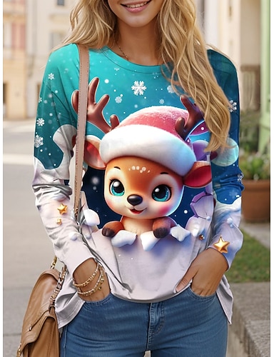 Karácsony Női Póló Grafika Állat Rénszarvas Divat Alkalmi Hosszú ujj Terített nyak Kerek Normál felsők Napi Hétvége Nyomtatott Medence Bíbor Lóhere Nyár Tavasz Ősz Tél
