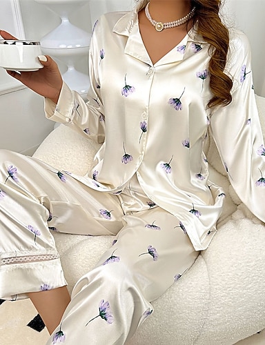 Per donna Pigiama Set Pigiama Casual Floreale Elastico in vita Pantalone Casa Quotidiano Da letto Manica Lunga Colletto a Camicia Bianco Autunno Inverno Vestibilità comoda