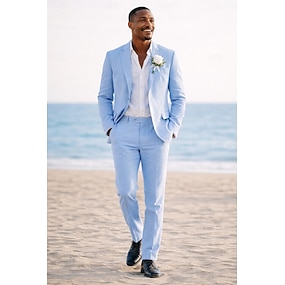 Uomo Completi in Lino Matrimonio in Spiaggia Casuale Azzurro cielo Estate Tuta Bavero a lancia Tinta unita Vestibilità standard 2 pezzi Monopetto a un bottone