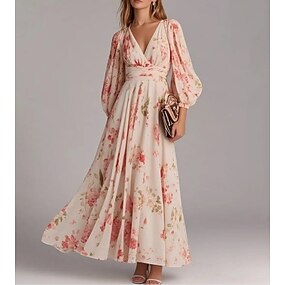 Per donna Abito maxi Abito Pieghettato Festa Casual Boho Quotidiano Data Uscire Vestibilità regolare Floreale Grafico Manica Lunga Scollo a V Rosa chiaro Estate Primavera