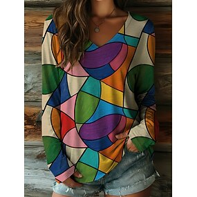 Per donna Maglietta Stampato Grafico Geometrico Blocco di colori Elegante Casual Manica Lunga Scollo a V Top Regolari Quotidiano Arcobaleno Primavera Autunno