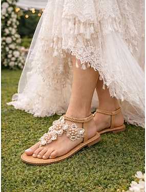 sandali bassi da sposa boho da donna con motivo floreale con perline: comode scarpe da sposa slip-on per matrimoni all'aperto, in spiaggia e in giardino