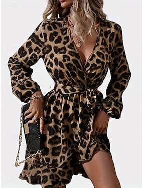 Per donna Mini Abito Vestito Casual Abito Stampato Moda Moderno Quotidiano Spiaggia Weekend Vestibilità regolare Leopardo Manica Lunga Scollo a V Marrone Estate Primavera Autunno