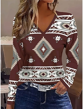 Per donna Maglietta Stampato Grafico Geometrico Tribale Vintage Elegante Classico Manica Lunga Scollo a V Top Regolari Quotidiano Marrone rossastro Primavera Autunno Inverno