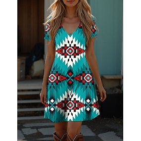 Abito Boho da donna Abito Western Vintage Mini Abito T Shirt Abito Tee Abito Estivo Abito Vacanza Casual Spiaggia Uscita Fit Regolare Grafica Tribale Manica Corta V Neck Rossa Blu Viola Verde Estate
