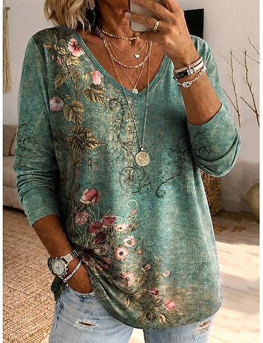 Per donna Maglietta Stampato Floreale Grafico Piante Vintage Elegante Classico Manica Lunga Girocollo Scollo a V Top Regolari Quotidiano Blu Primavera Autunno