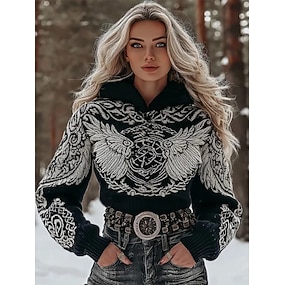 maglione vintage vichingo da donna, per le vacanze, vintage, quotidiano, con cappuccio, floreale, a maniche lunghe, regular top, lavorato a maglia, quotidiano, weekend, nero, primavera, autunno