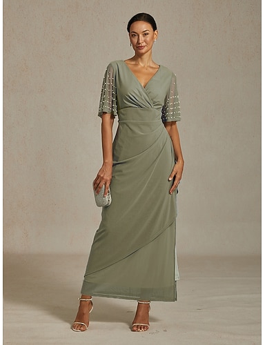 Per donna Abito maxi Tubino Elegante Manica a Volant Ospite di nozze Cocktail party Rete Abbellito Vestibilità regolare Tinta unica Mezza Manica Scollo a V Verde salvia