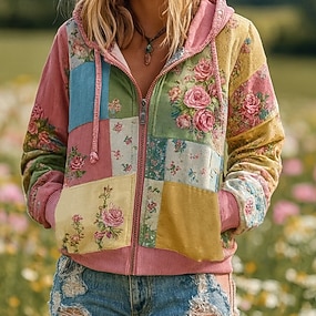 Per donna Felpe con cappuccio Patchwork Cerniera Tasca Floreale Grafico Elegante Caldo Vintage Manica Lunga Con Cappuccio Top Regolari Streetwear Abbigliamento Quotidiano Verde Cachi Primavera Autunno