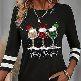 Blusa Natalizia da Donna Collo a V Stampa Cappello Bicchieri di Vino T-Shirt Festiva Casual per Feste Comoda