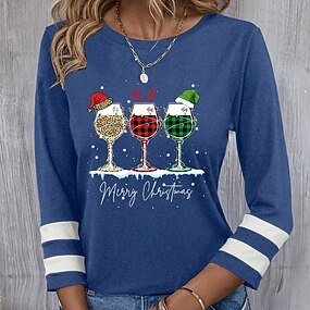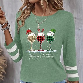 Camicia Blusa Donna Natale Bicchiere di Vino Casual Manica Lunga Collo Crew Regular Tops Quotidiana Patchwork Nera Vino Blu Verde Autunno Inverno