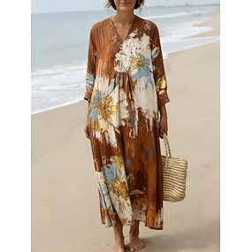 Per donna Orlo Maxi Abito maxi Arancione Mezze maniche Floreale Piante Coulisse Scollo a V Morbido Estate Primavera Scollo a V Bohemien Vacanza Moda XS S M