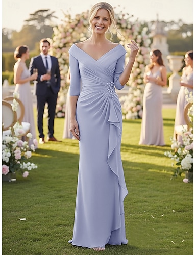 Tubino Colonna Strascico a Terra Abito da invitata a nozze Chiffon Abito Formale Abito da cerimonia per signora Manica 3/4 Scollo a V Elegante Semplice Formale Ospite di nozze Chiffon con Arricciato